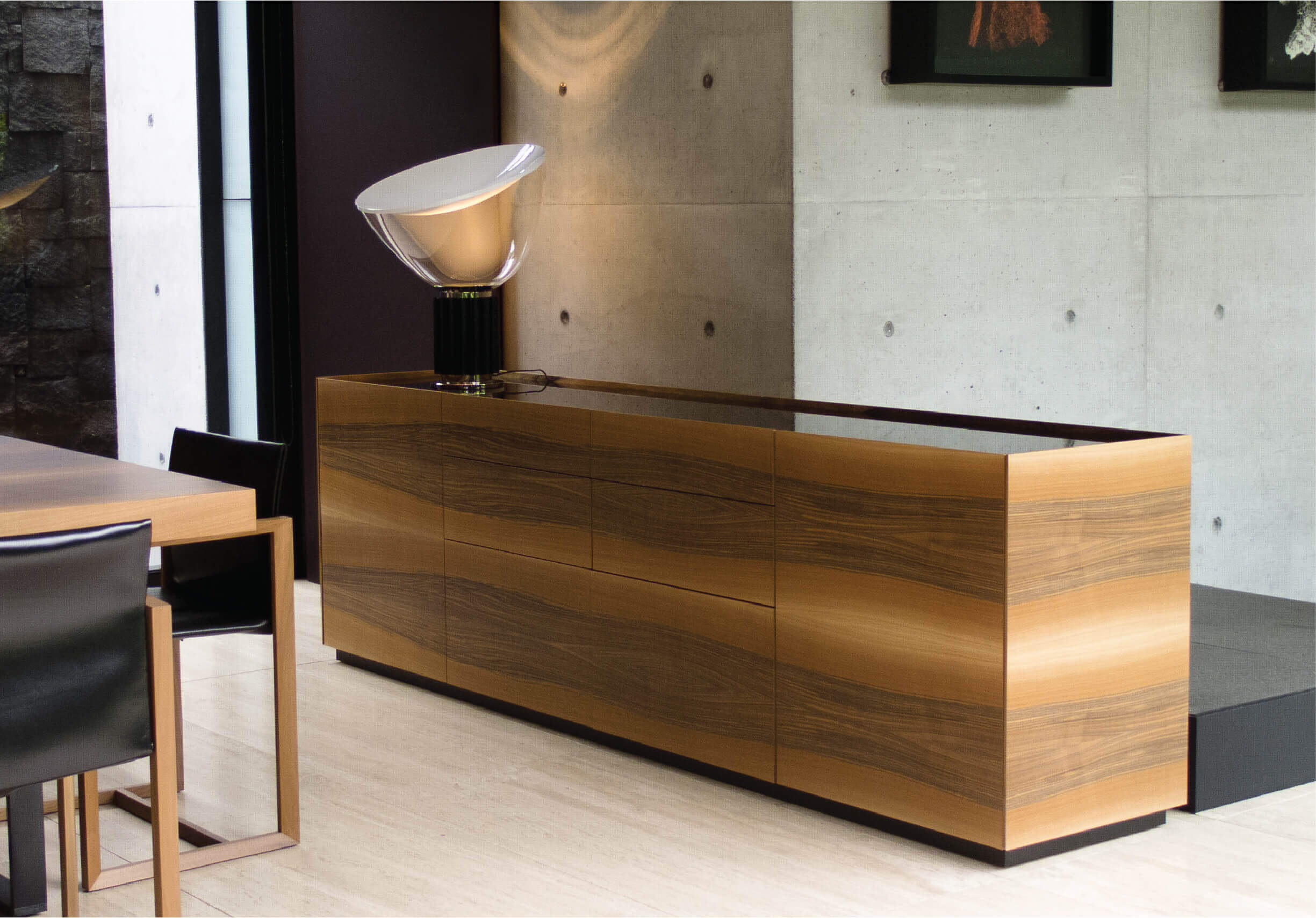 Mobile ausiliario profondità 45cm o 50cm. Con piano superiore in cristallo nero, ripiano interno in legno ad altezza regolabile e 3+3 o 4+4 cassetti con sistema premi apri. Base in metallo o legno. Disponibile con porta penne a richiesta.