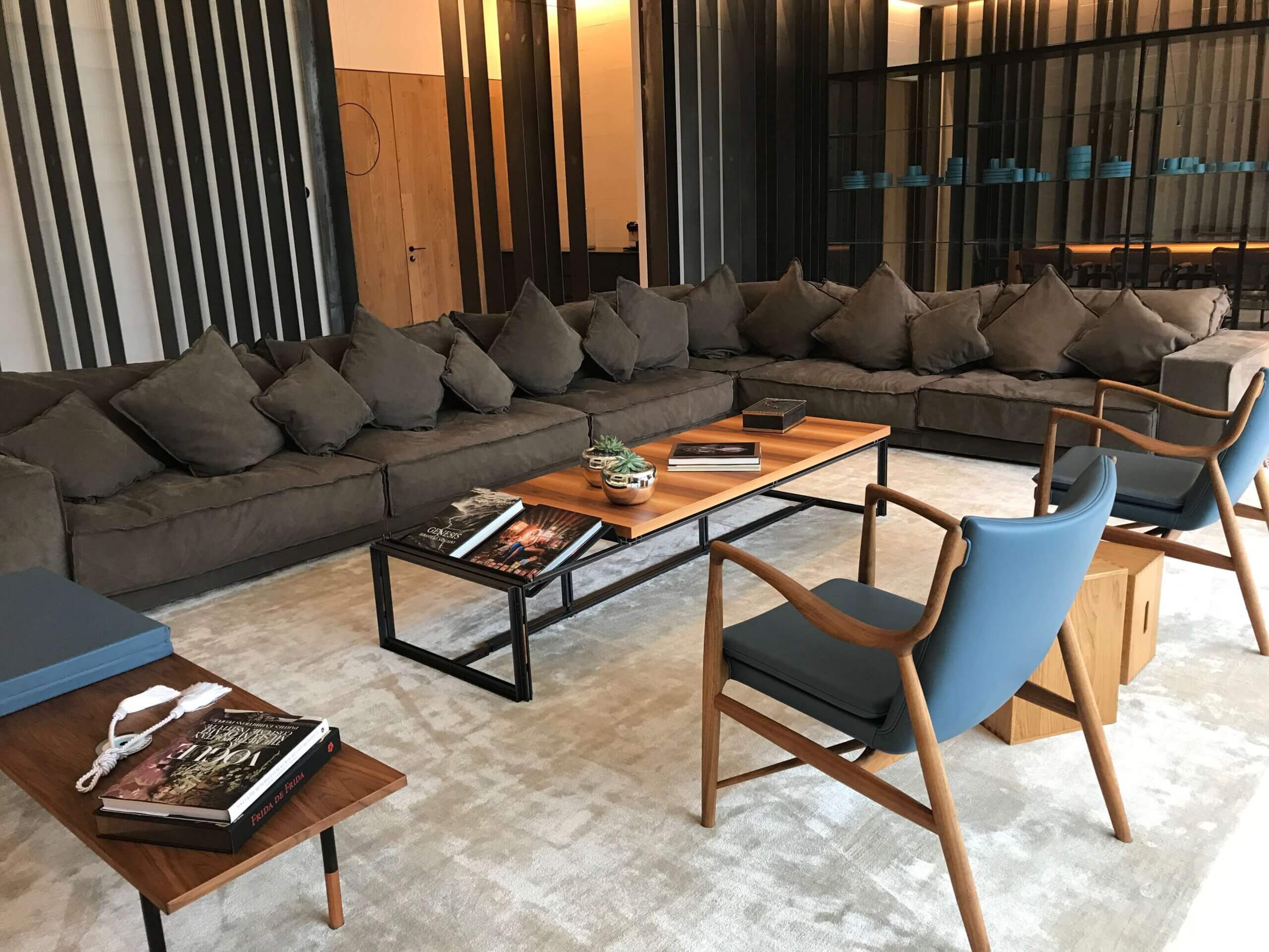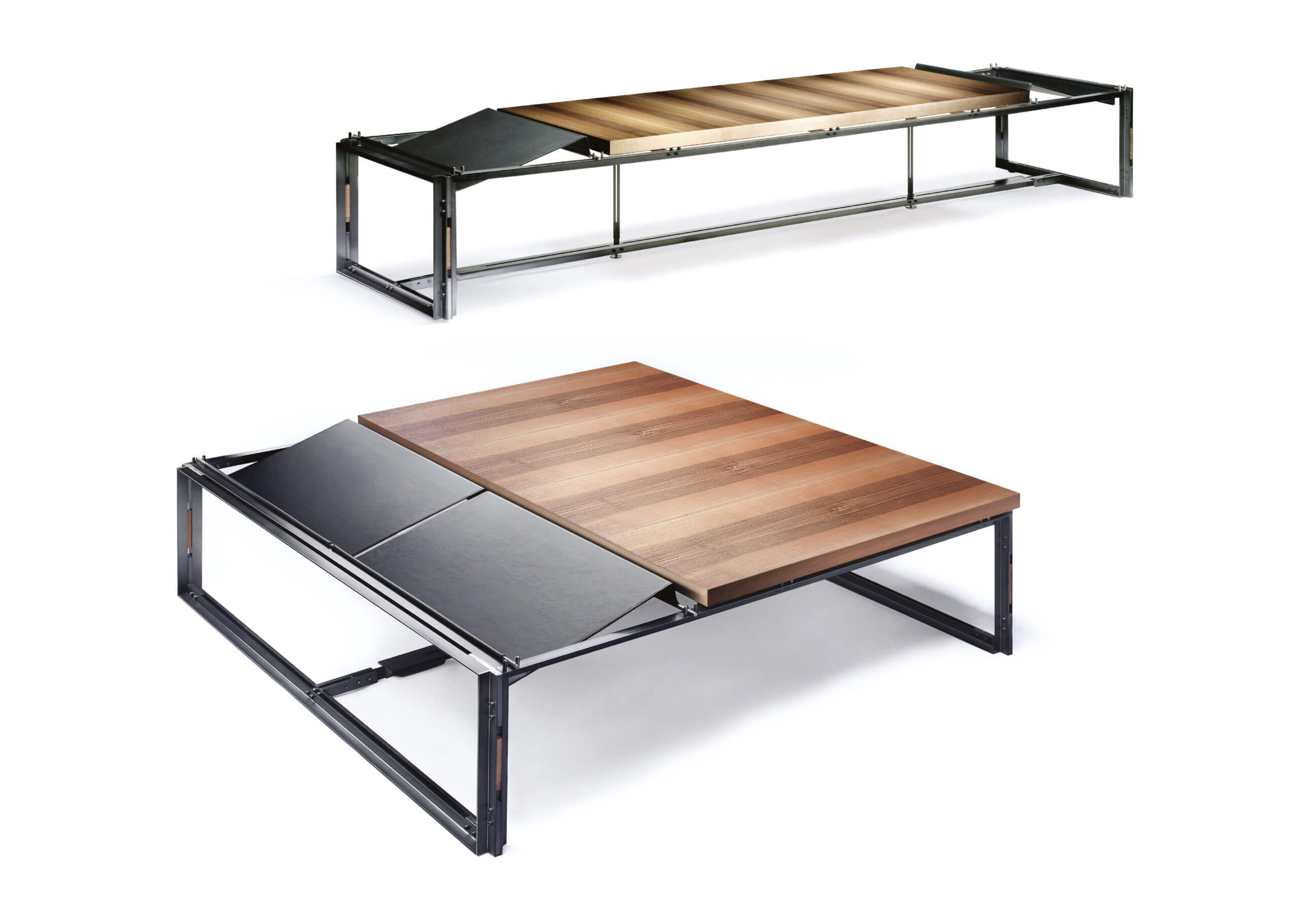 Tavolo basso/panca, dotato di un elegante portariviste posto su entrambi i lati in pelle nera, struttura in metallo nichel anti cato e piano in noce.