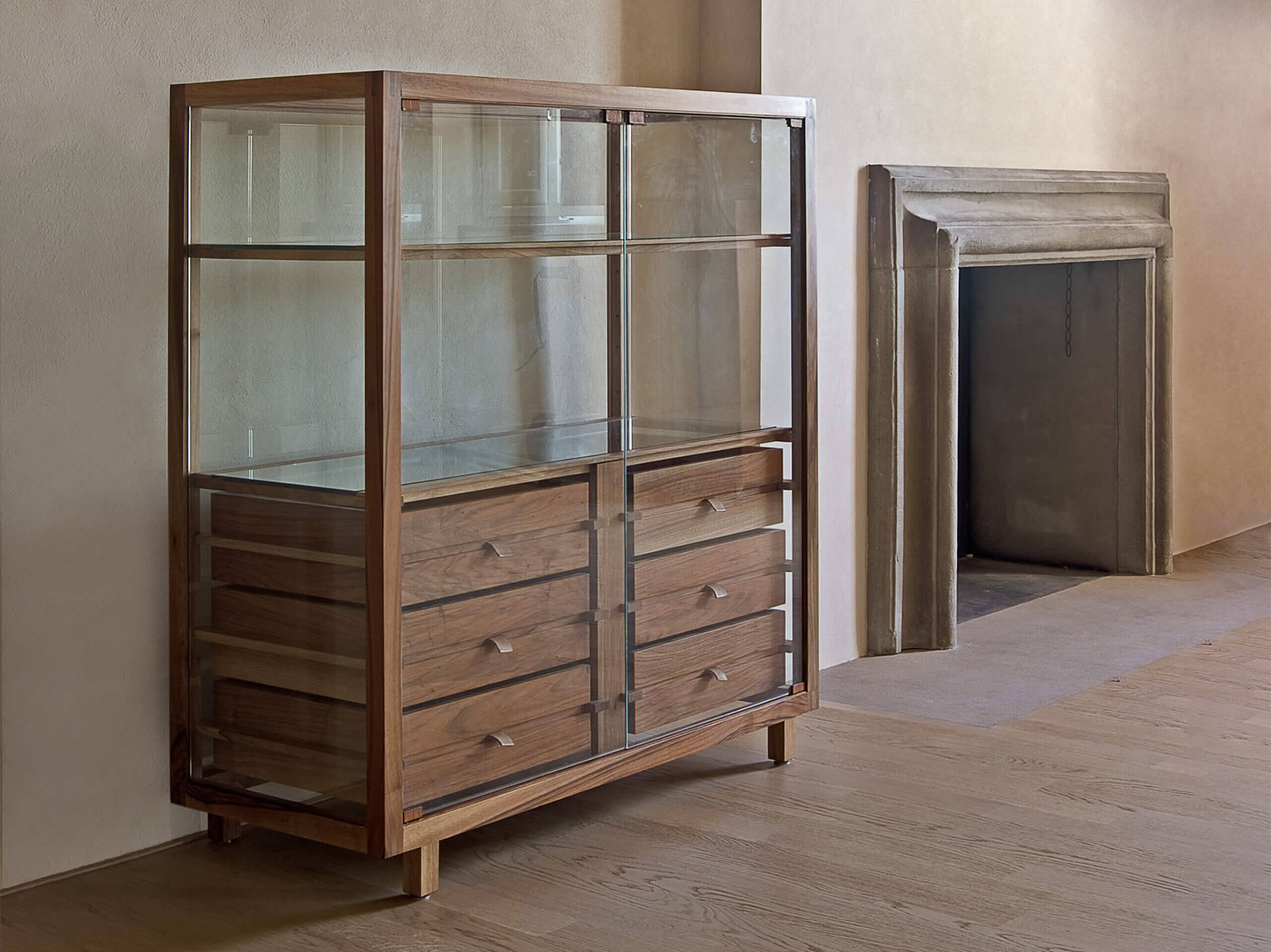 Mobile in noce massello con un ripiano in noce o cristallo e 6 cassetti. Le maniglie dei cassetti sono realizzate in cuoio pieno fiore. Top, fianchi e schienale in cristallo. Disponi- bile con ante in cristallo tem- perato con chiusura in metallo rivestita in cuoio pieno fiore